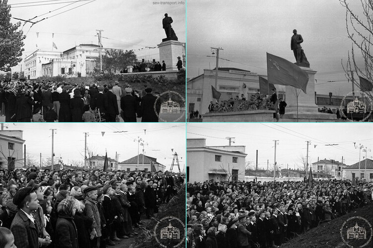 Открытие памятника В.И. Ленину на территории троллейбусного управления. Улица Льва Толстого, Троллейбусное управление, 21.04.1956. Фото: С.И. Муравьёв. Из фондов ФГБУК "Музей-заповедник героической обороны и освобождения Севастополя". Источники: http://goskatalog.ru/portal/#/collections?id=22806094 http://goskatalog.ru/portal/#/collections?id=22806291 http://goskatalog.ru/portal/#/collections?id=22806357 http://goskatalog.ru/portal/#/collections?id=22806343 |
