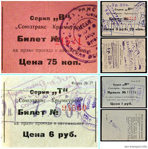 Образцы билетов предприятия "Союзтранс" после преобразования из АО "Крымкурсо", 1930-1931 гг. 1) На право проезда в автомашине, цена 75 коп. Источник: https://facebook.com (архив Низами Ибраимова). 2) На право проезда в автомашине, цена 6 руб. с надпечатками 7,50 руб. и 9,35 руб. Из фондов Государственного исторического музея. Источник: https://catalog.shm.ru/entity/OBJECT/4440082 3) На право проезда в автомашине по маршруту Севастополь - Мисхор, цена 3 руб. 25 коп. с надпечатками 4,00 руб., 5,30 руб., 9,35 руб. Источники: https://numismat.ru/auct-lo/1014/77080a.jpg https://numismat.ru/auct-lo/1014/77080b.jpg 4) Ярлык на право проезда в автомашине на перегонах, при посадке в пути, цена 1 руб. с надпечаткой 9,35 руб. Источники: https://numismat.ru/auct-lo/1014/77080c.jpg https://numismat.ru/auct-lo/1014/77080d.jpg |