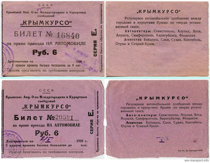 Образцы билетов АО "Крымкурсо" на право проезда на автомобиле, цена 6 руб., 1928 г.
